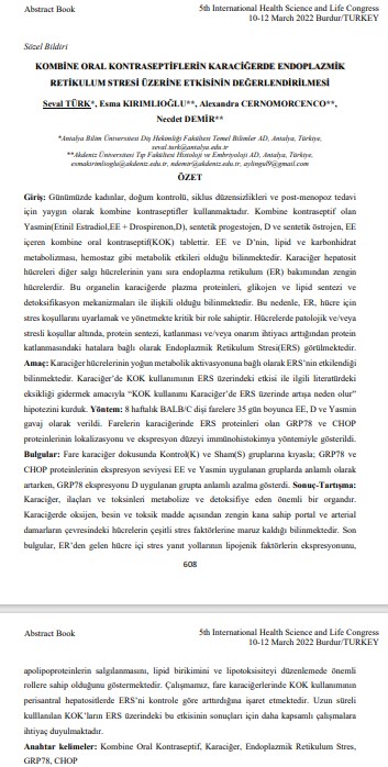 Giriş: Günümüzde kadınlar, doğum kontrolü, siklus düzensizlikleri ve post-menopoz tedavi için yaygın olarak kombine kontraseptifler kullanmaktadır. Kombine kontraseptif olan Yasmin(Etinil Estradiol,EE + Drospirenon,D), sentetik progestojen, D ve sentetik östrojen, EE içeren kombine oral kontraseptif(KOK) tablettir. EE ve D’nin, lipid ve karbonhidrat metabolizması, hemostaz gibi metabolik etkileri olduğu bilinmektedir. Karaciğer hepatosit hücreleri diğer salgı hücrelerinin yanı sıra endoplazma retikulum (ER) bakımından zengin hücrelerdir. Bu organelin karaciğerde plazma proteinleri, glikojen ve lipid sentezi ve detoksifikasyon mekanizmaları ile ilişkili olduğu bilinmektedir. Bu nedenle, ER, hücre için stres koşullarını uyarlamak ve yönetmekte kritik bir role sahiptir. Hücrelerde patolojik ve/veya stresli koşullar altında, protein sentezi, katlanması ve/veya onarım ihtiyacı arttığından protein katlanmasındaki hatalara bağlı olarak Endoplazmik Retikulum Stresi(ERS) görülmektedir. Amaç: Karaciğer hücrelerinin yoğun metabolik aktivasyonuna bağlı olarak ERS’nin etkilendiği bilinmektedir. Karaciğer’de KOK kullanımının ERS üzerindeki etkisi ile ilgili literatürdeki eksikliği gidermek amacıyla “KOK kullanımı Karaciğer’de ERS üzerinde artışa neden olur” hipotezini kurduk. Yöntem: 8 haftalık BALB/C dişi farelere 35 gün boyunca EE, D ve Yasmin gavaj olarak verildi. Farelerin karaciğerinde ERS proteinleri olan GRP78 ve CHOP proteinlerinin lokalizasyonu ve ekspresyon düzeyi immünohistokimya yöntemiyle gösterildi.