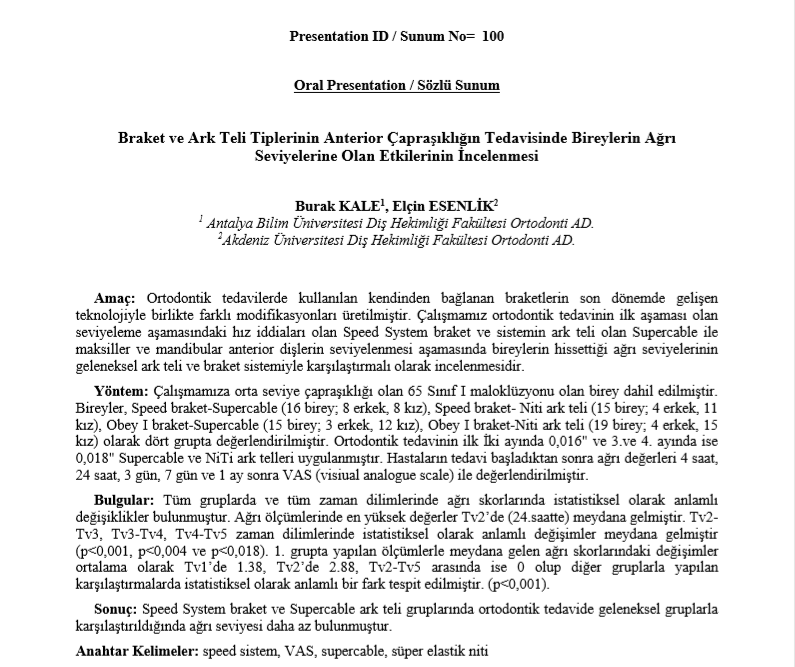Amaç: Ortodontik tedavilerde kullanılan kendinden bağlanan braketlerin son dönemde gelişen teknolojiyle birlikte farklı modifikasyonları üretilmiştir. Çalışmamız ortodontik tedavinin ilk aşaması olan seviyeleme aşamasındaki hız iddiaları olan Speed System braket ve sistemin ark teli olan Supercable ile maksiller ve mandibular anterior dişlerin seviyelenmesi aşamasında bireylerin hissettiği ağrı seviyelerinin geleneksel ark teli ve braket sistemiyle karşılaştırmalı olarak incelenmesidir. Yöntem: Çalışmamıza orta seviye çapraşıklığı olan 65 Sınıf I maloklüzyonu olan birey dahil edilmiştir.